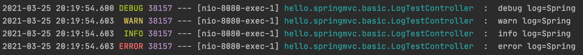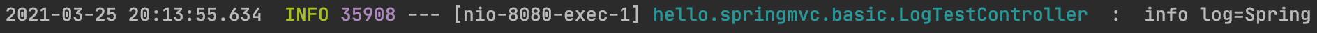 위와같이 날짜, 시간, log level, 쓰레드, 컨트롤러이름, 전달한 내용(string, name) 같이 여러 정보가 함께 나온다.