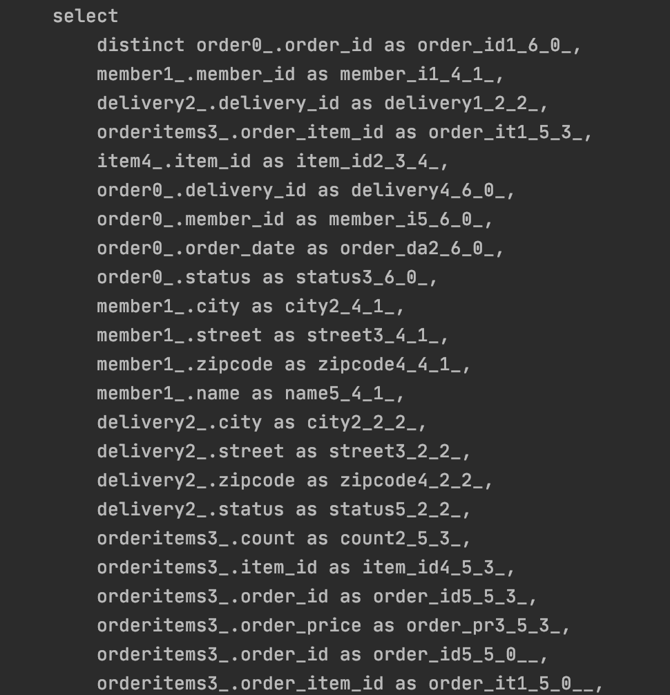 이 전과 마찬가지로 컬렉션을 join하면 관계형 데이터베이스에서는 Order의 개수만큼 데이터가 뻥튀기된다.
