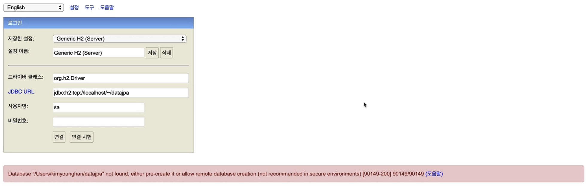 jdbc:h2:~/{원하는 데이터베이스 이름}