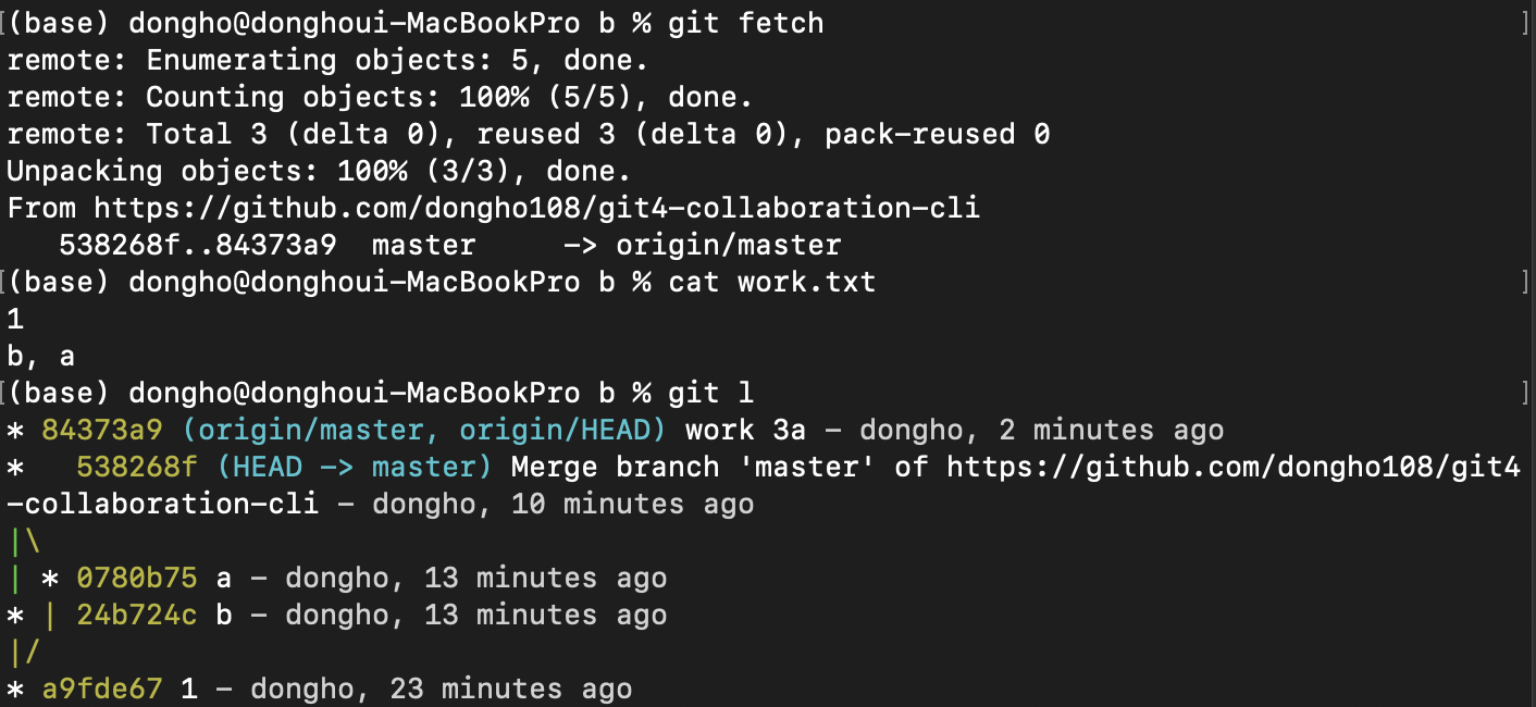 왼쪽은 pull로 가져왔고 오른쪽은 fetch로 가져왔다.