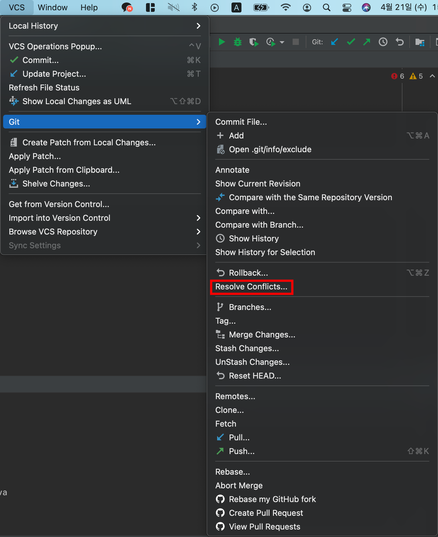 그리고 merge conflict가 발생했을 때는 아래와 같이 Resolve Conflicts가 활성화 된다.