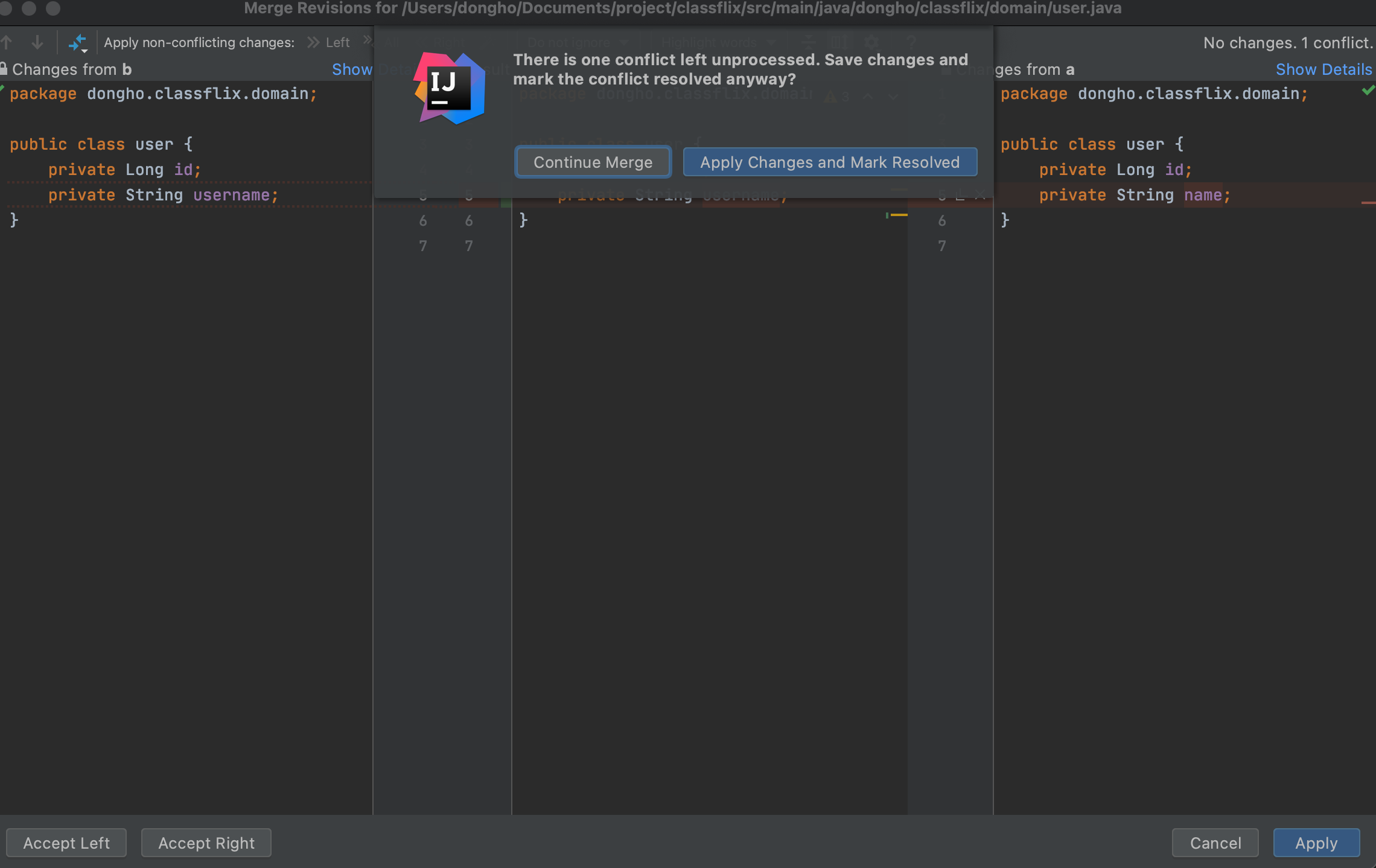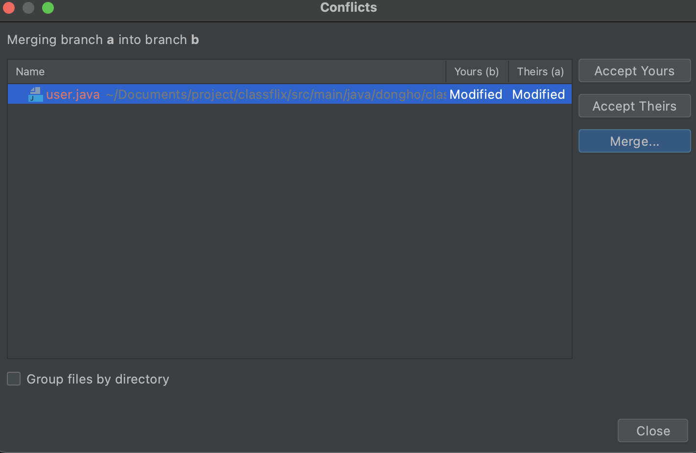 클릭을 하면 merge conflict가 발생한 파일 목록이 뜨고, merge를 누르면
