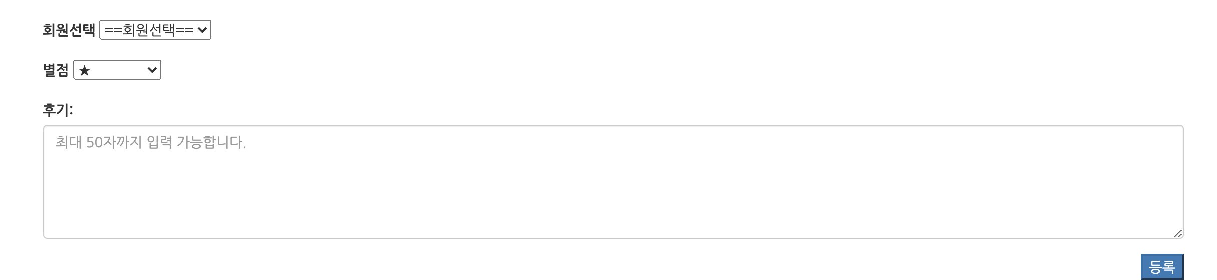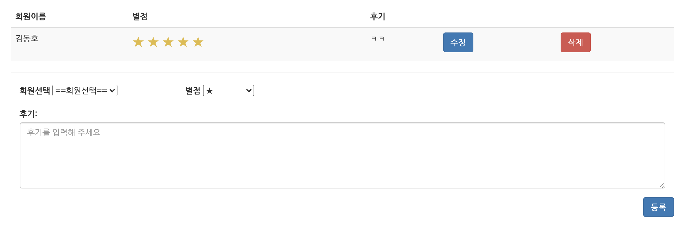 리뷰 등록 부분에서 회원선택, 별점선택 창이 가로로 나열되어있으면 보기에 더 좋을 것 같습니다.