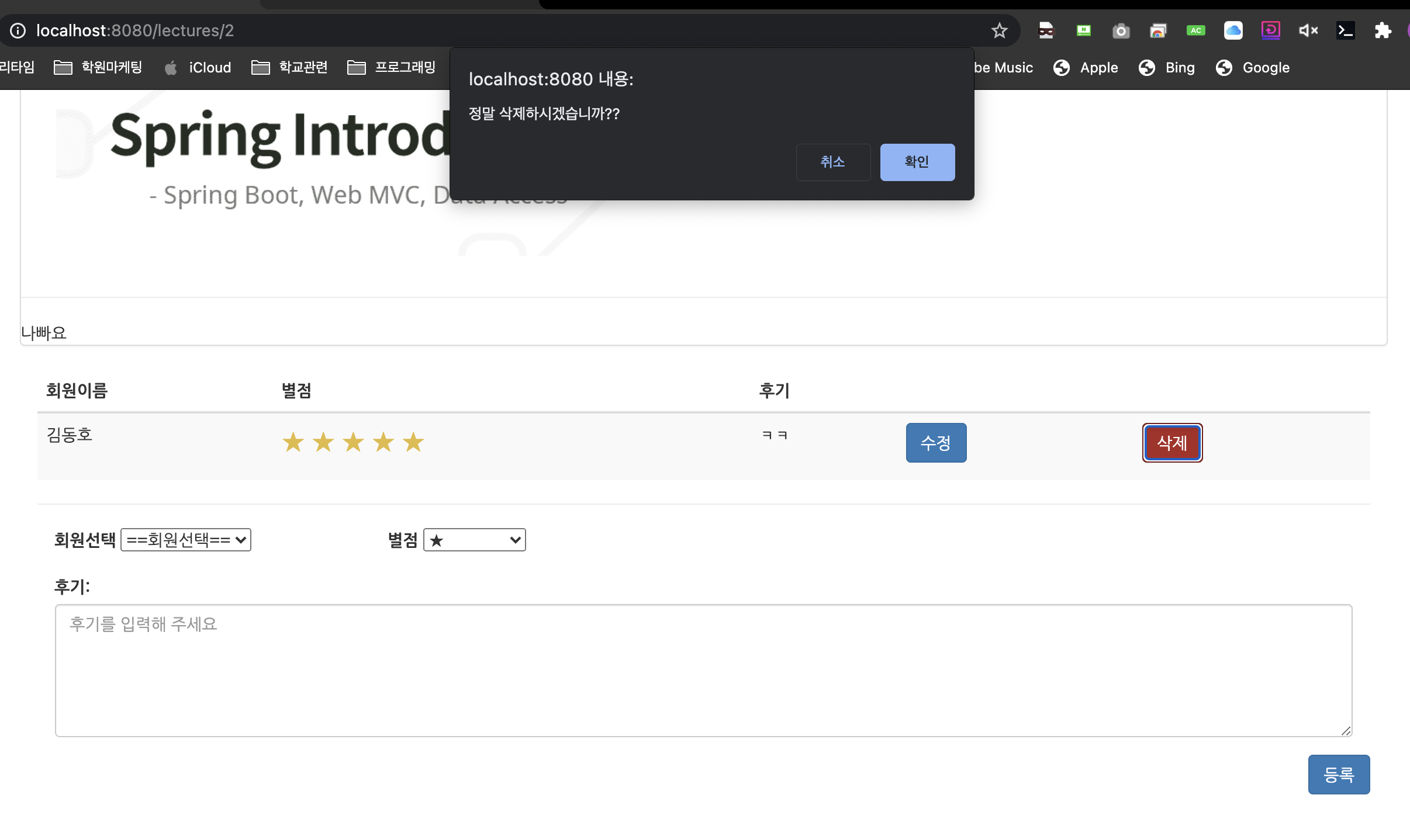 삭제버튼은 잘못클릭했을 때 손해가 클 수 있기때문에 javascript로 확인과정을 한번 더 거치도록 했습니다.