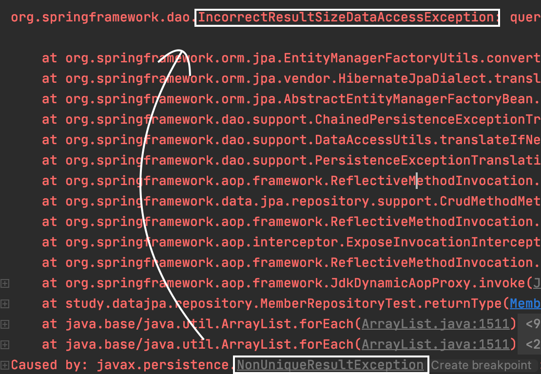 단건조회시 여러개일때 -> NonUniqueResultException이 터짐(JPA의 예외처리) -> spring data jpa가 spring framework의 IncorrectResultSizeDataAccessException으로 변환