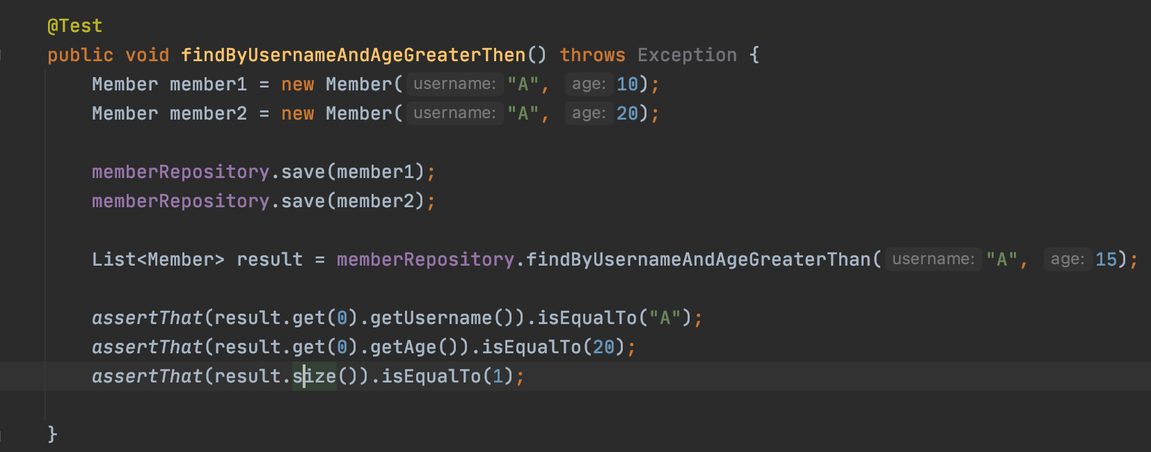 List<Member> findByUsernameAndAgeGreaterThan(String username, int age);
