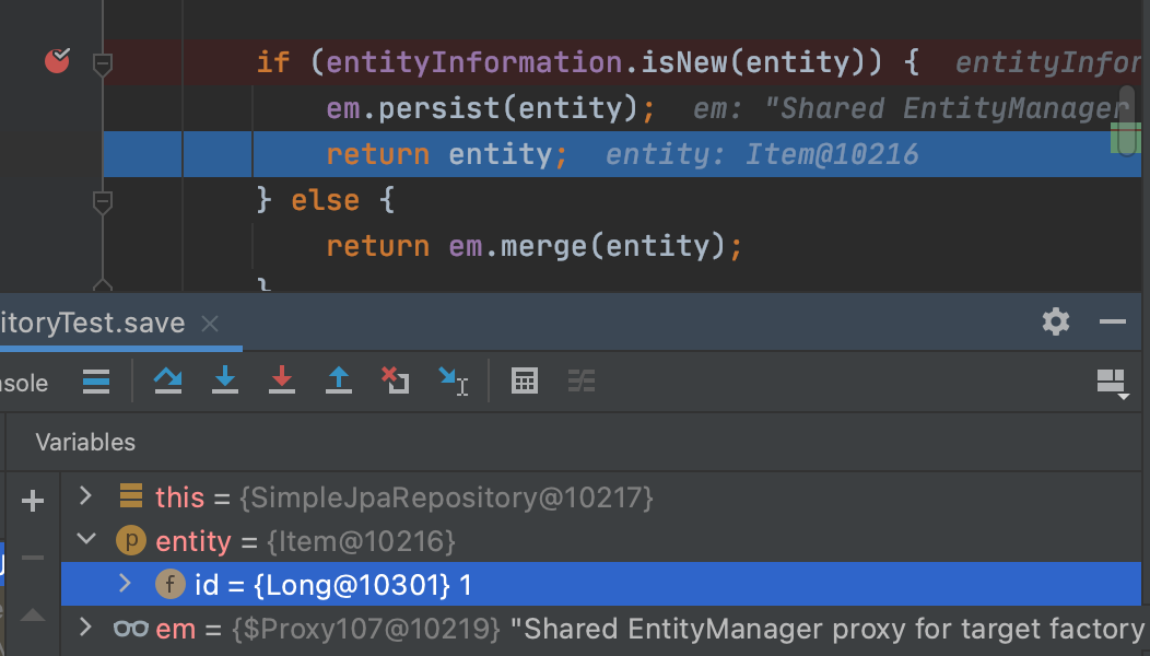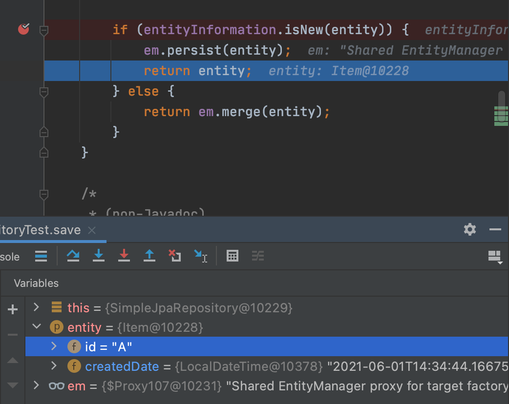 isNew함수를 override해서 createdDate로 새로운 엔티티를 구별해냈기 때문에 em.persist가 호출된 것을 볼 수 있습니다.