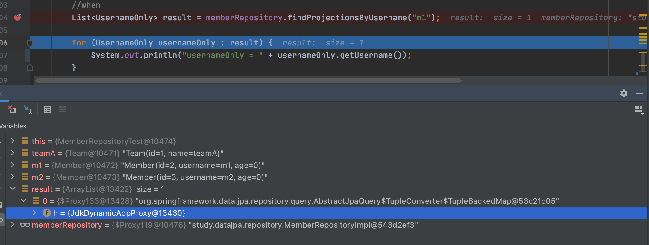List<UsernameOnlyDto> result = memberRepository.findProjectionsByUsername("m1");