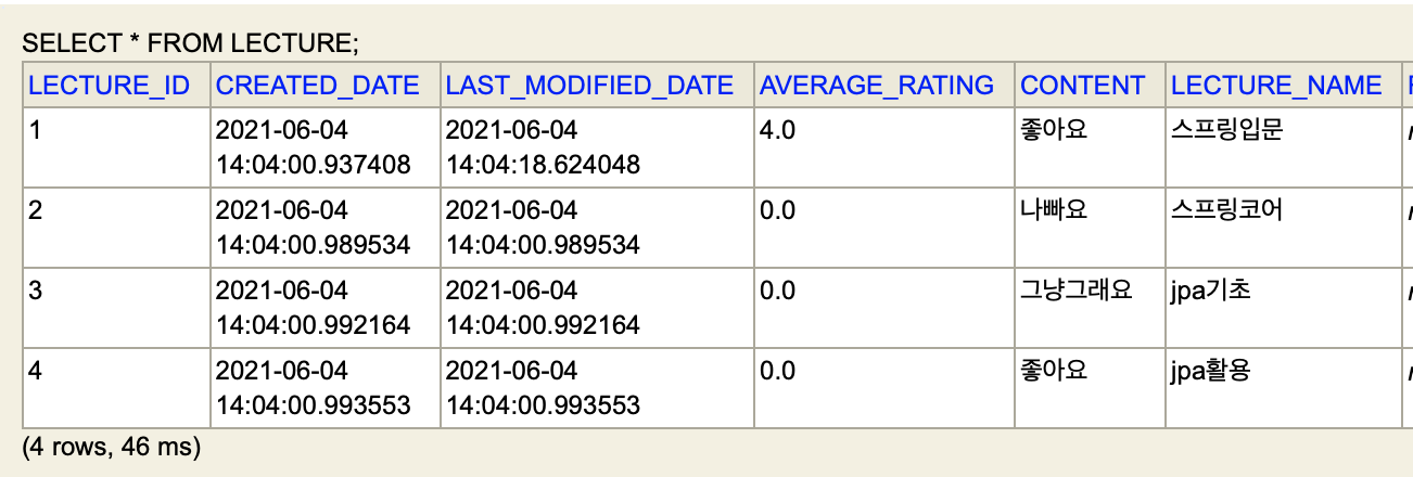 애플리케이션에서 회원등록, 강의등록도 잘 동작하고 강의정보 페이지에서도 회원이 잘 불러와 지는 것을 확인하였습니다.