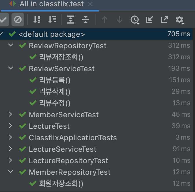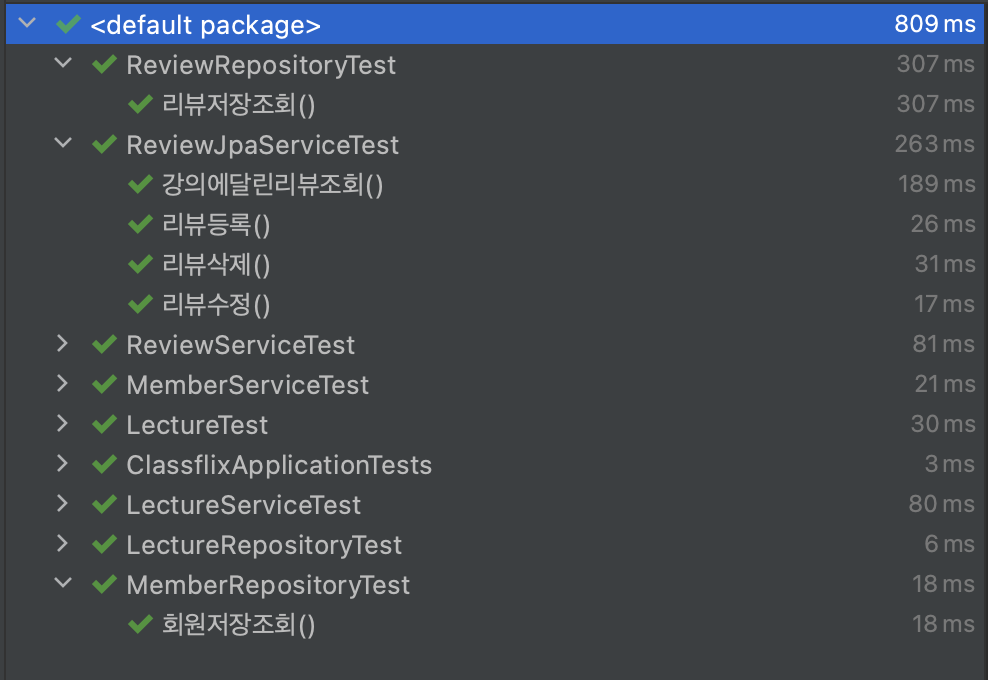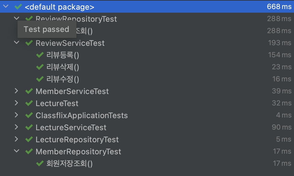 원래 순수 Jpa로 짰던 코드의 반환값이 스프링 데이터 JPA와 달랐기 때문에 이 부분을 수정 해주었고, Optional로 반환되는 findById에 대한 테스트도 orElseThrow를 통해 해결하도록 했습니다.