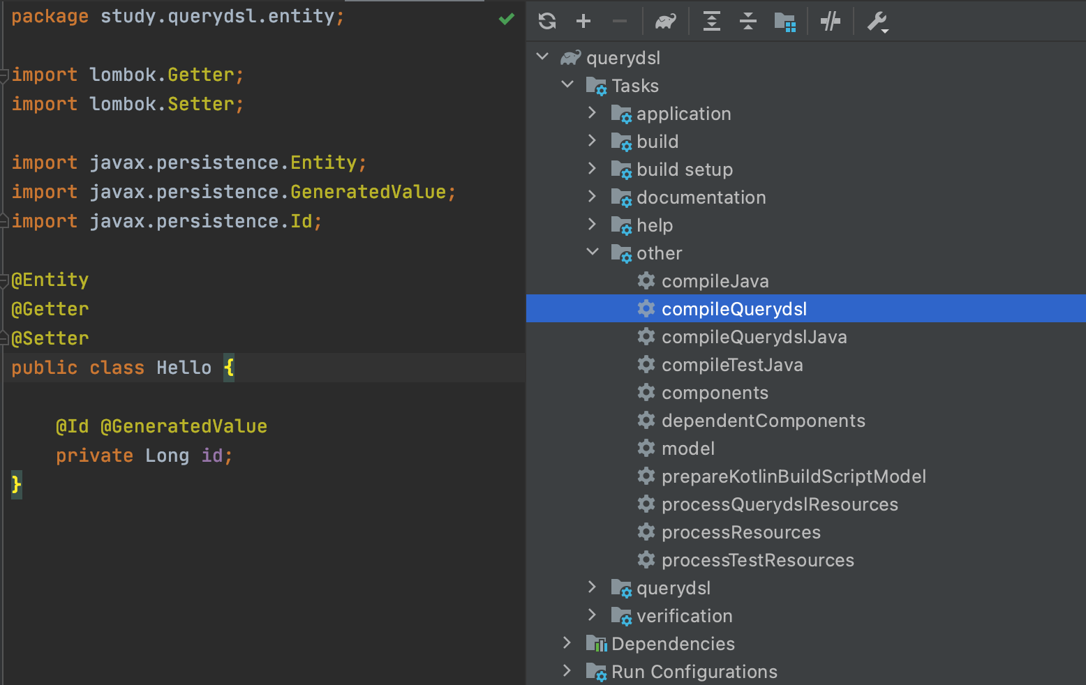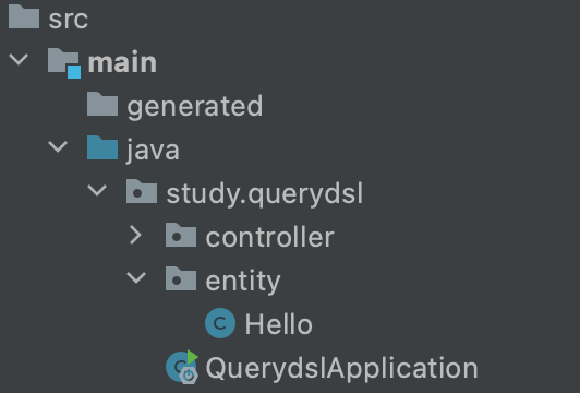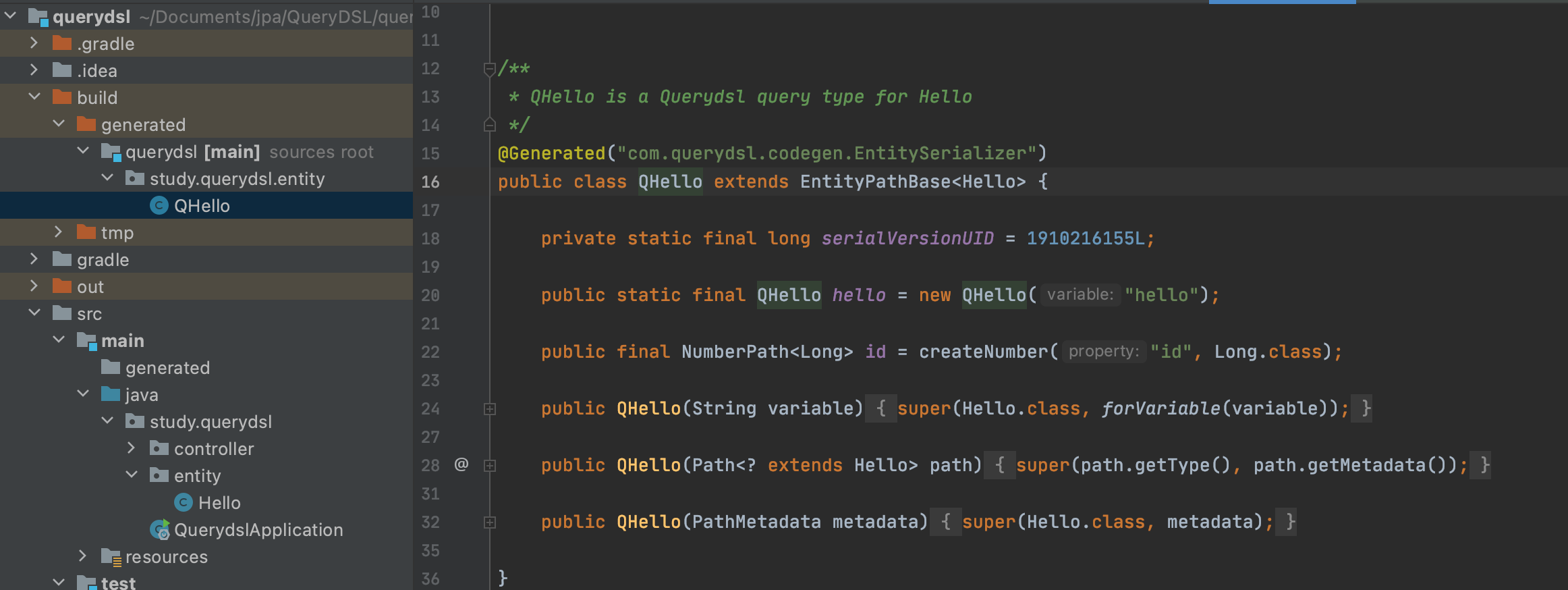 프로젝트 폴더에 build/generated 경로에서 Hello 엔티티와 똑같은 경로로 Hello 엔티티의 Q파일이 생성되었습니다.