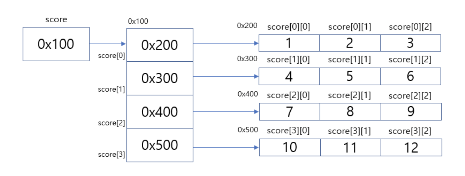 int[][] score = new int[4][3]; // 4행 3열의 데이터, 12개의 공간