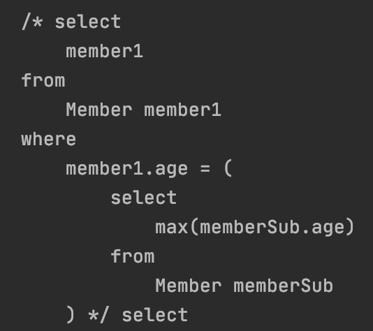 이때 서브쿼리 안에는 서브쿼리 밖에 있는 엔티티와 다른 엔티티가 필요하기 때문에 새로 선언해 만들어줍니다.