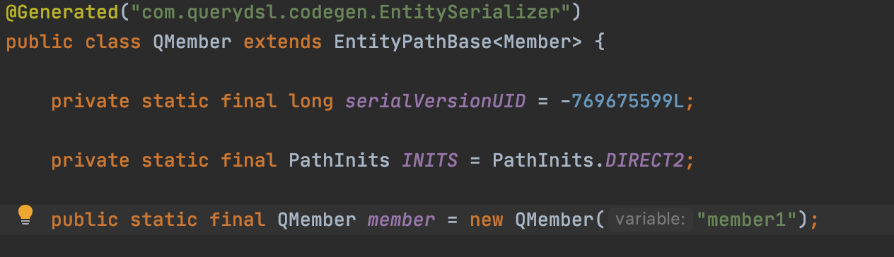 QMember의 public static final QMember member = new QMember("member1") 를 이용해서