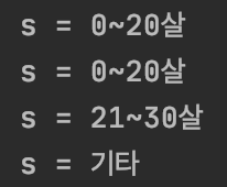 .when(member.age.between(0, 20)).then("0~20살")