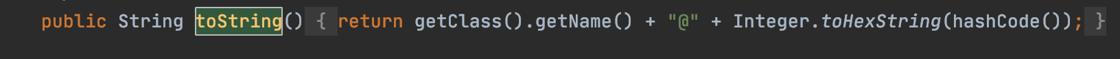 클래스를 작성할 때 toString()을 오버라이딩 하지 않고 사용한다면 위의 내용이 그대로 사용되어 16진수의 hashCode가 출력됩니다.