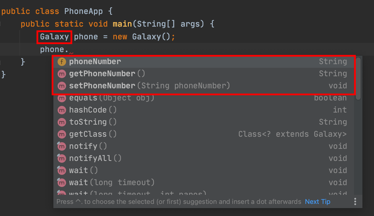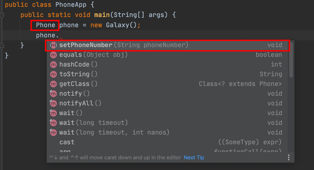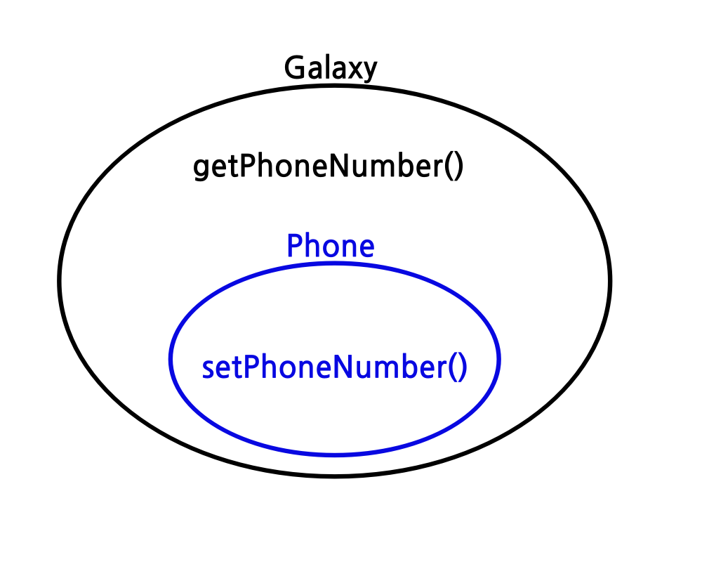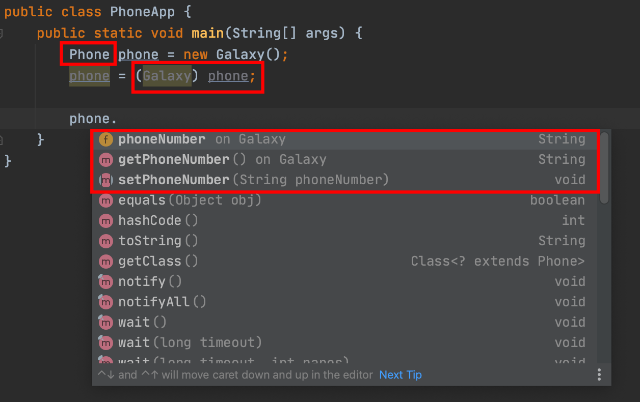 Galaxy 타입으로 Phone를 사용하면 Phone의 메서드, Gaxlay의 메서드 둘 다 사용이 가능합니다.