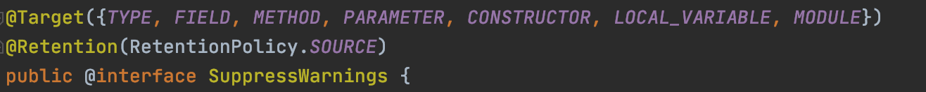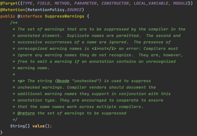 @SuppressWarning의 경우 요소가 String[] value 하나뿐이므로 애노테이션을 적용할 때 요소의 이름을 생략할 수 있습니다.