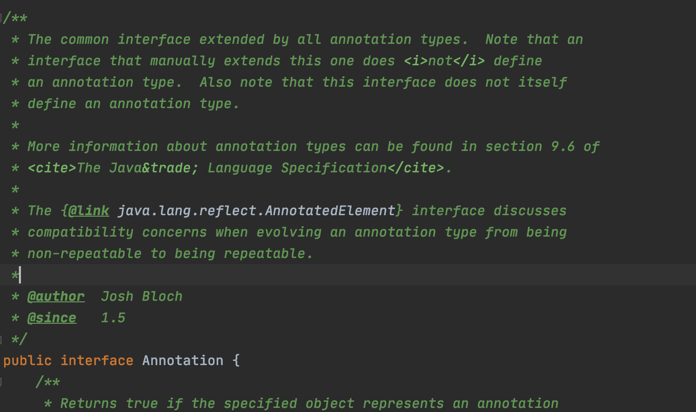 아래는 모든 애노테이션의 조상은 Annotation 인터페이스의 실제 소스코드의 일부입니다.