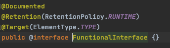 @FunctionalInterface는 @Override처럼 컴파일러가 체크해주는 애노테이션이지만, 실행 시에도 사용되므로 유지 정책이 RUNTIME으로 되어있습니다.