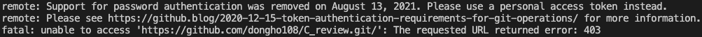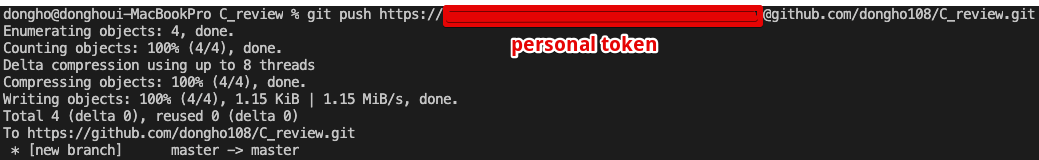 $ git push https://<발급받은개인인증키>@github.com/dongho108/C_review.git