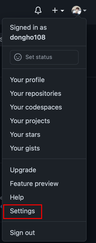 깃허브 홈페이지에서 프로필을 클릭하고 setting, 그 다음 Developer settings로 들어가 줍니다.