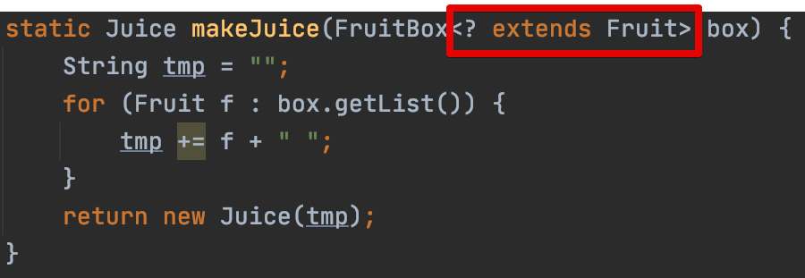 아래의 makeJuice는 제네릭 클래스인 FruitBox타입을 매개변수로 받습니다.