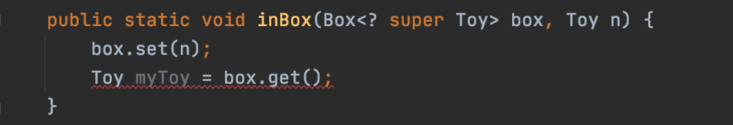 여기서 Box<Toy> box 대신 Box<? super Toy> box로 바꾸어주겠습니다.