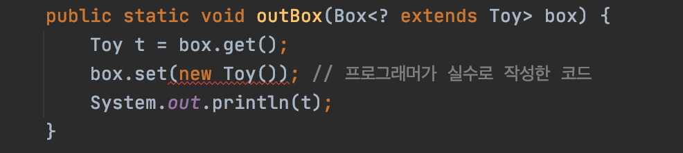 | Box<? extends Toy> box | out(get) 작업만 허용 |