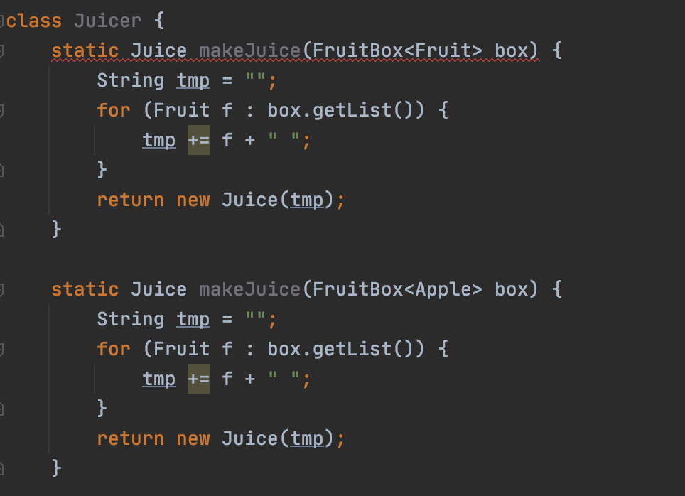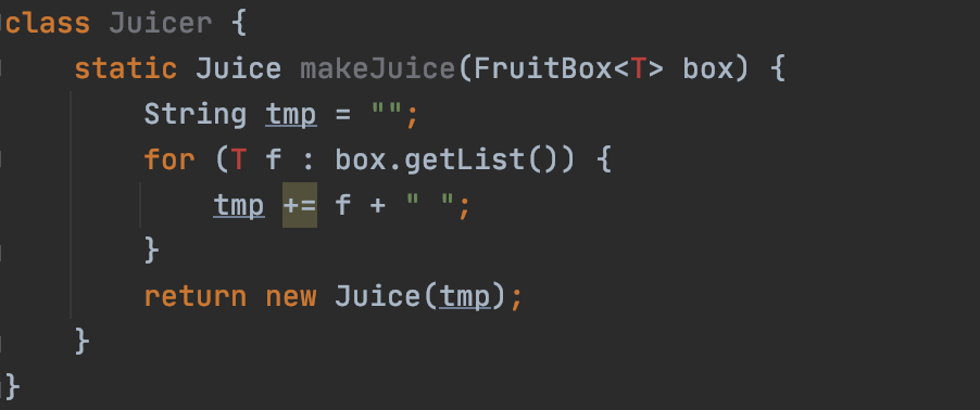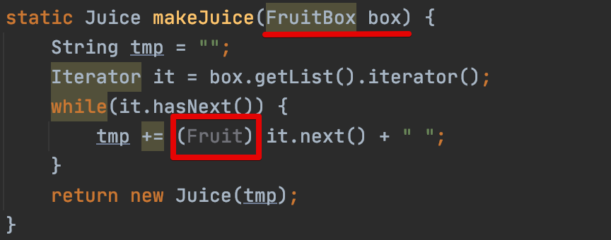 System.out.println(Juicer.<Fruit>makeJuice(fruitBox));