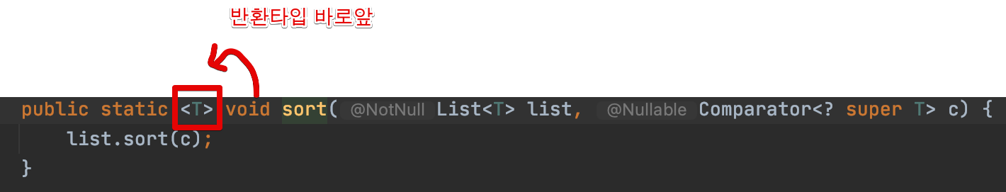 제네릭 타입의 선언 위치는 반환타입 바로 앞입니다.