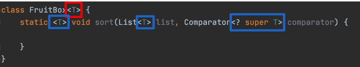 <T extends Fruit> : 사용되는 T는 Fruit로 치환, 그리고 클래스 옆의 선언은 제거