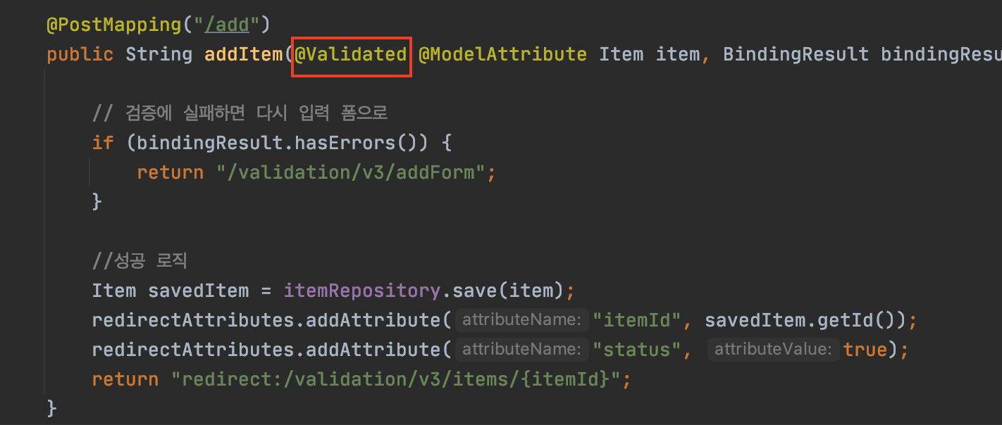 public String addItem(@Validated @ModelAttribute("item") ItemSaveForm form, BindingResult bindingResult, RedirectAttributes redirectAttributes, Model model) {