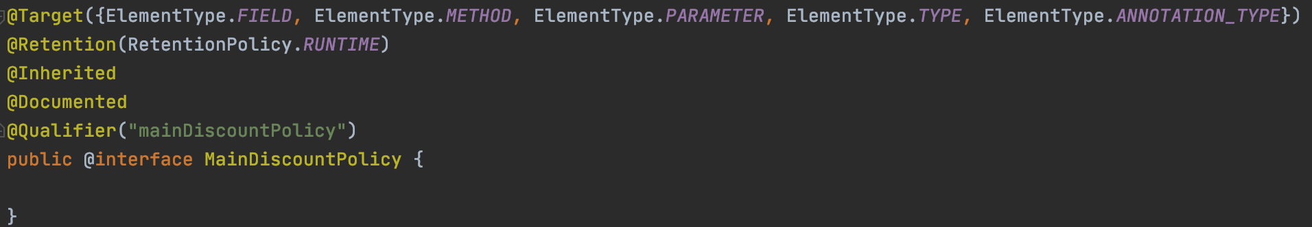 DiscountPolicy discountPolicy 대신에 @Qualifier("mainDiscountPolicy) DiscountPolicy RateDiscountPolicy