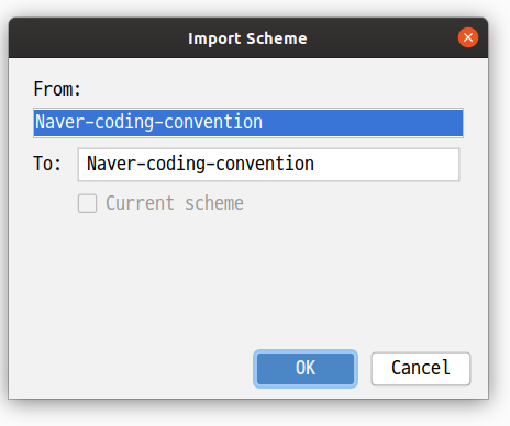 - TO 항목에는 naver-intellij-formatter.xml 안에 선언된 'Naver-Coding-Convnetion-v1.2’와 같은 이름이 디폴트로 나온다. 이 이름은 IntelliJ에서 전역적인 식별자가 되어서 다른 프로젝트에도 참조가 된다. 포멧터를 커스터 마이징했거나 프로젝트마다 다른 포멧터 설정을 쓴다면 이 스키마의 이름이 유일성 있게 인지되도록 수정한다.