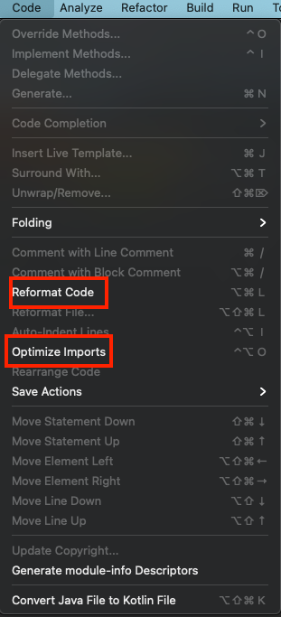 - Code > Reformat Code, Optimize Imports