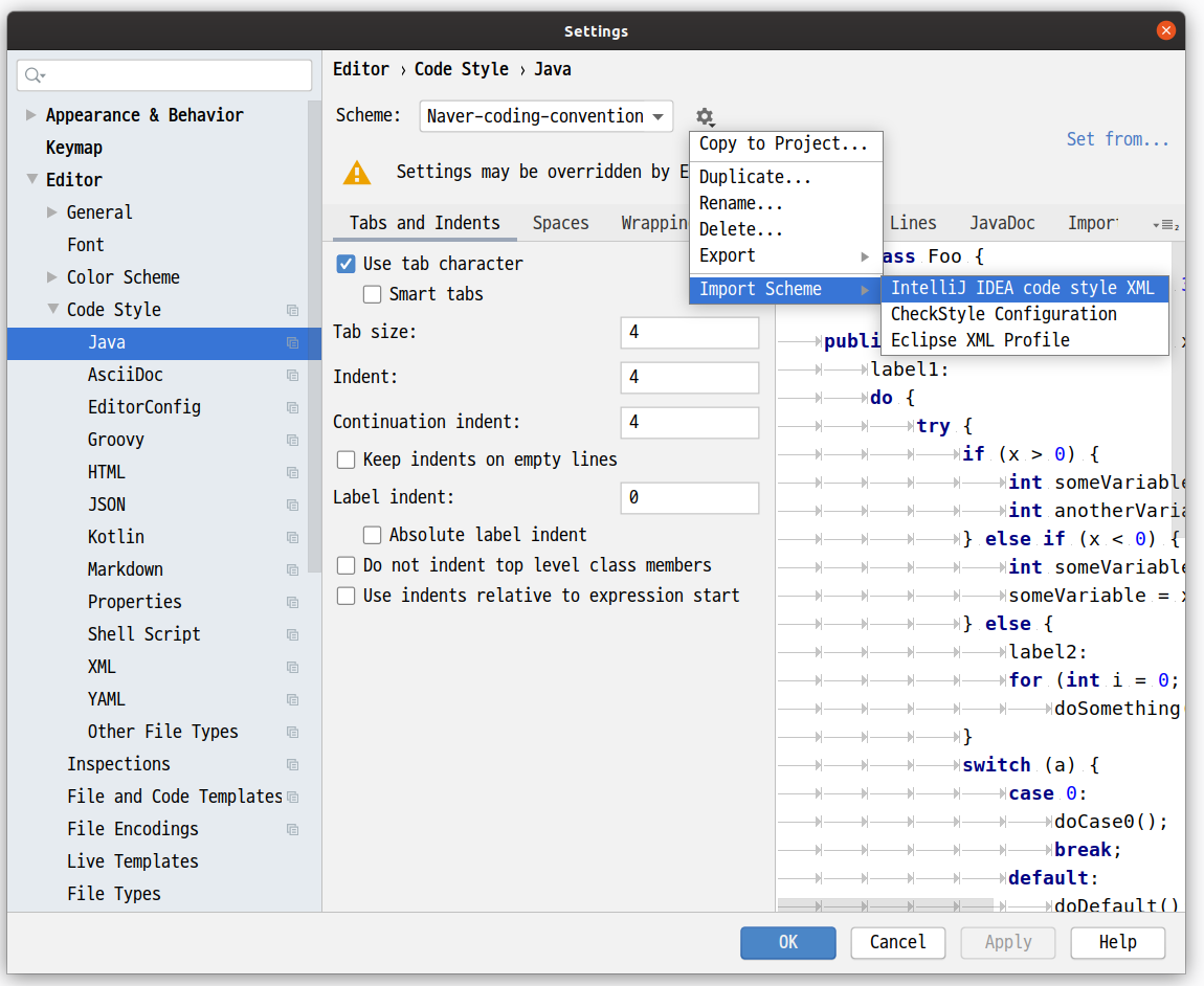 - Editor > Code Style > Java 항목으로 이동한다.