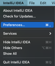 - IntelliJ IDEA > Preferences... 메뉴로 이동한다. (단축키 Alt + Shift + S )