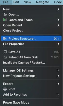 File -> Project Structure... -> Project Settings의 Project -> Project SDK에서 Java 1.8 버전을 선택해줍니다.