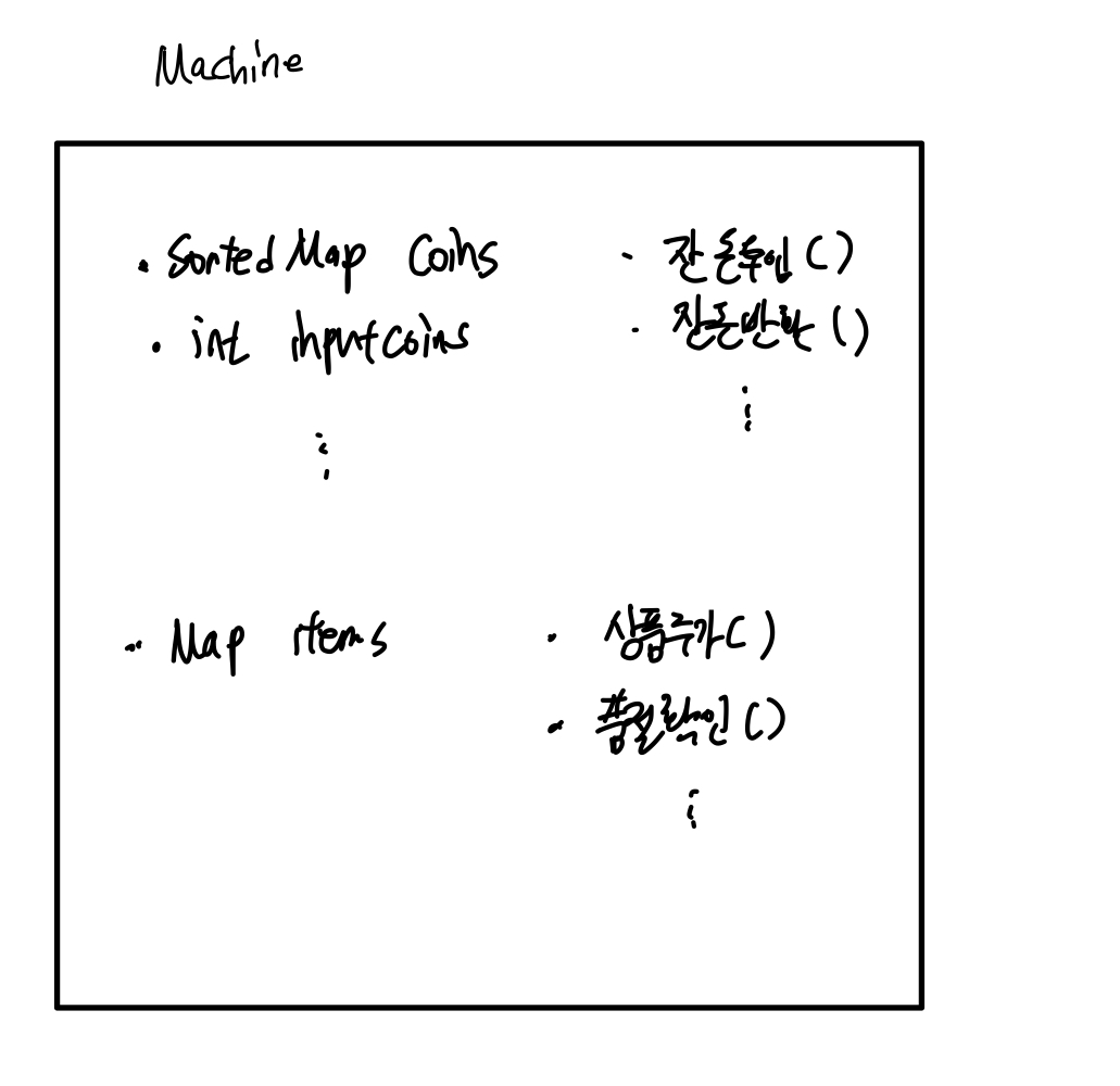 그래서 바로 제 코드의 Machine 객체가 떠올랐고 Machine객체 안에서 Item을 저장하고 coin을 찾고 등등의 메서드를 구현하고 수행하고 있었습니다.