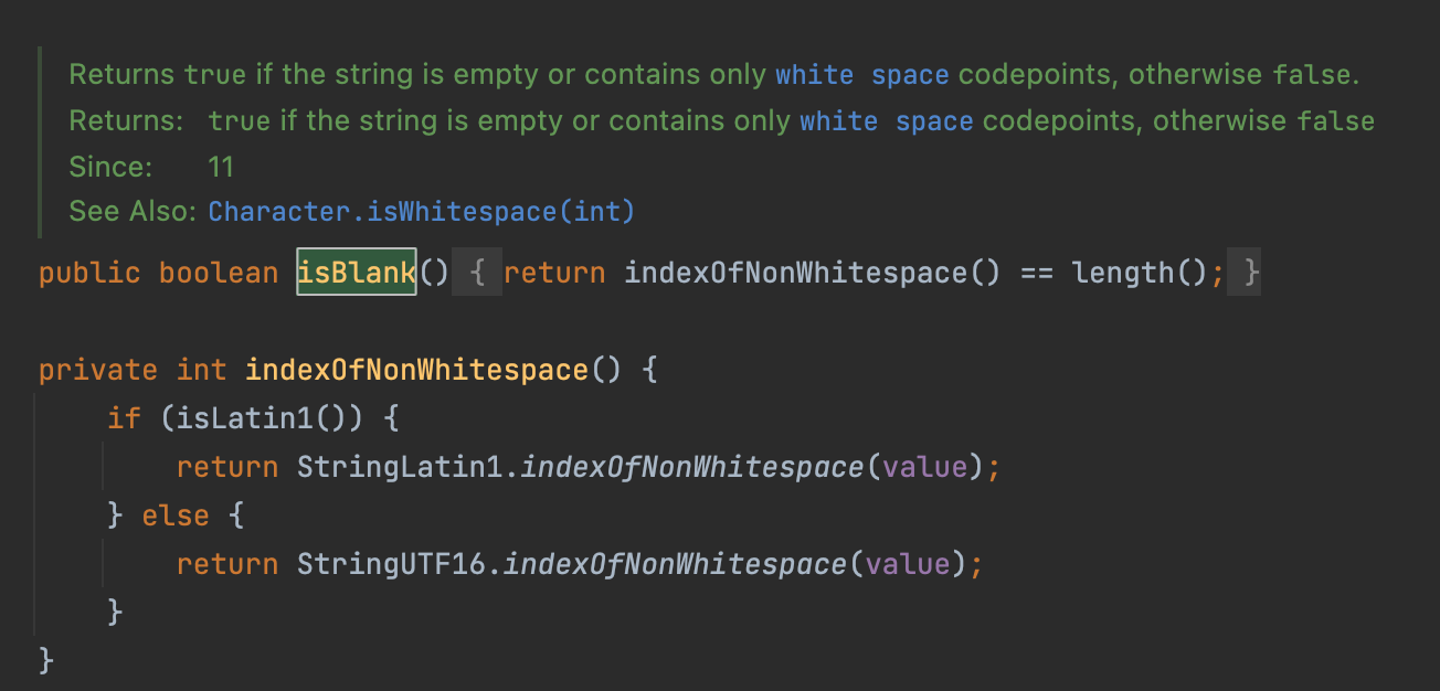 isBlank()는 whitespace(공백)이 아닌 문자의 인덱스와 문자열의 길이를 비교합니다.