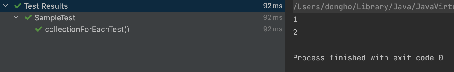 Collection.forEach의 경우에는 fail-fast 이므로 반복을 중지하고 다음 요소가 처리되기 전에 예외를 확인합니다.