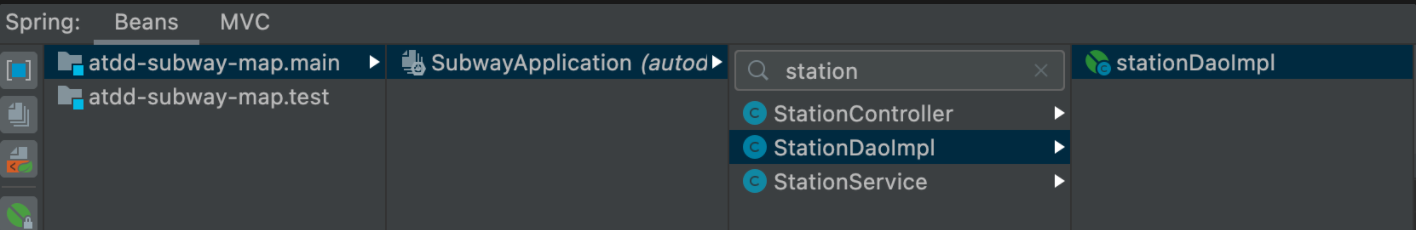 스프링은 컨테이너에서 인터페이스 StationDao의 구현체중 빈으로 등록된 객체를 찾아서 주입합니다.