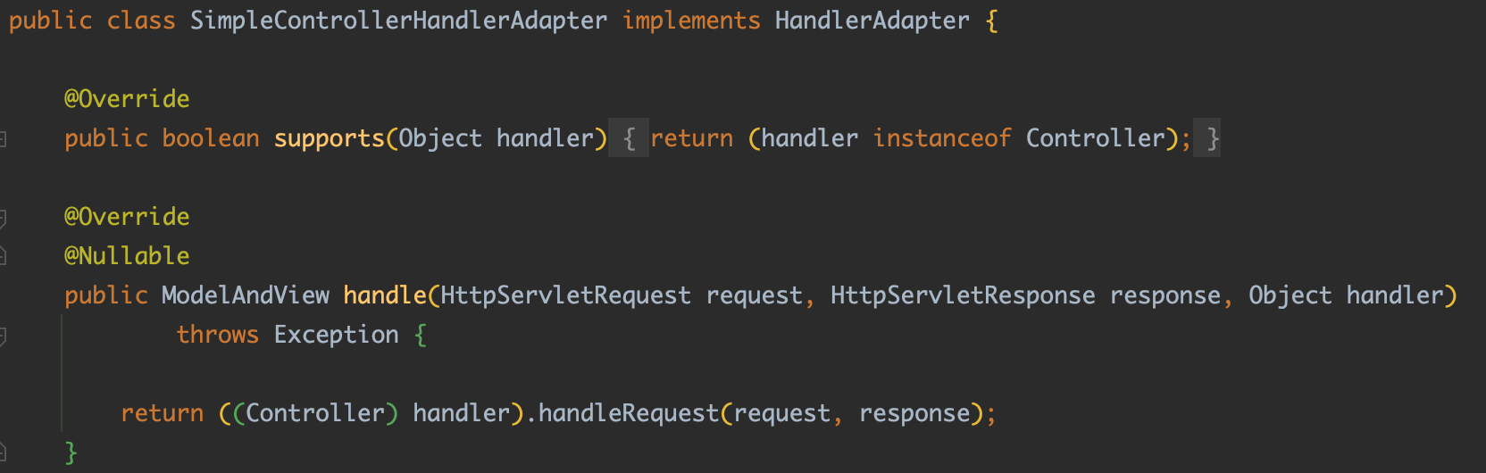 실제로 SimpleControllerHandlerAdapter에서 해당 Controller 인터페이스의 인스턴스가 맞는지 확인하는 코드도 볼 수 있습니다.