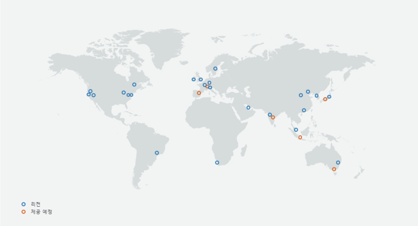 리전안에 최소 3개의 가용영역을 둠으로써 정전, 낙뢰, 태풍, 지진 등과 같은 천재지변에서도 데이터를 안전하게 보호할 수 있습니다.