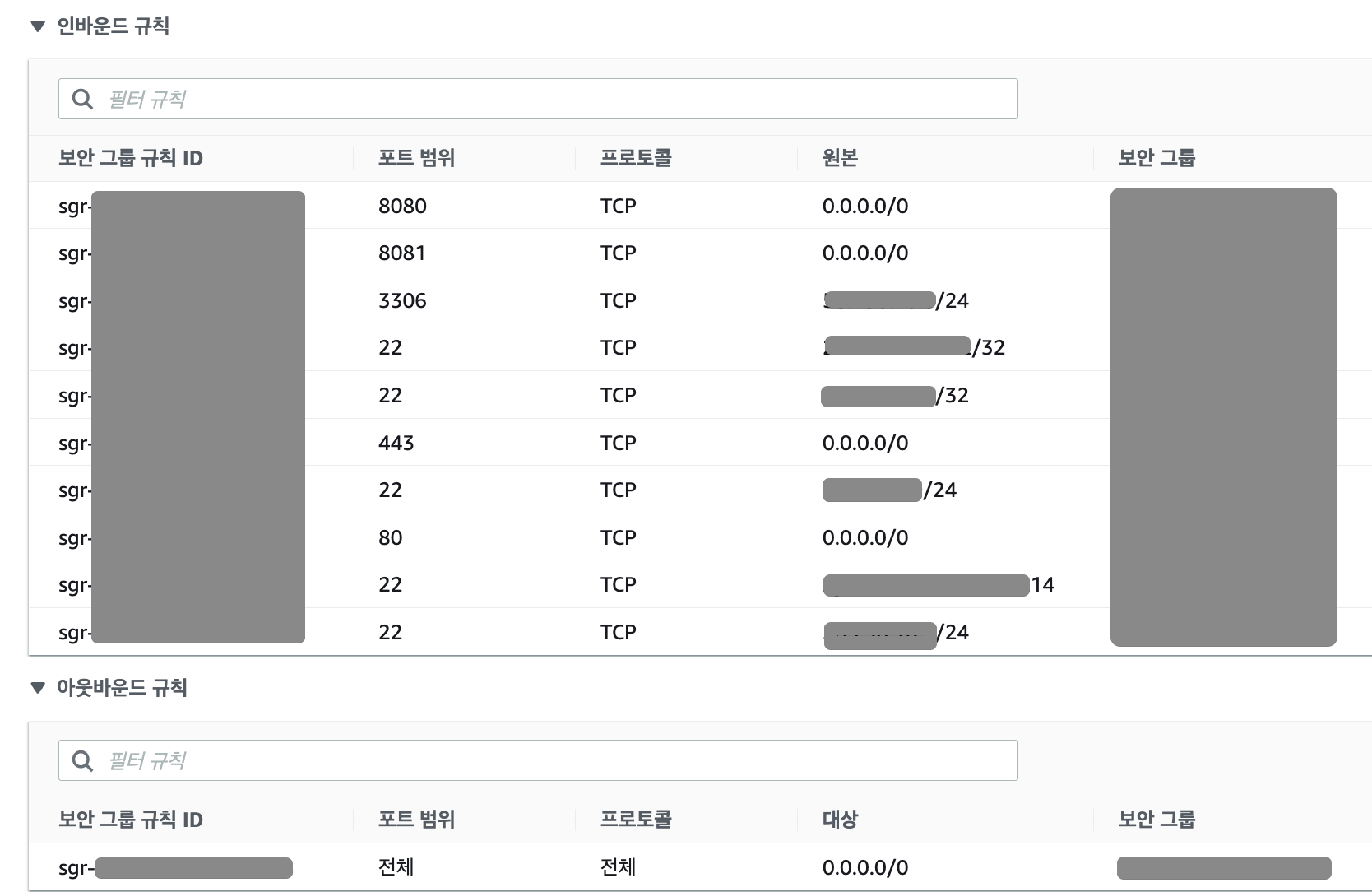 인바운드, 아웃바운드 규칙에 대해 아래처럼 어떤 IP와 포트번호를 허용할 것인지 설정해줄 수 있습니다.