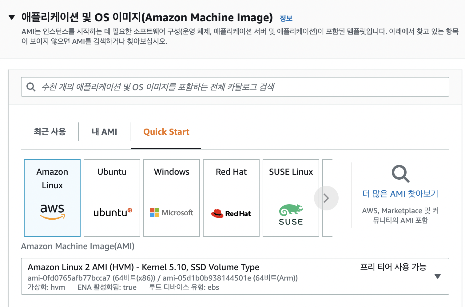 aws ec2에는 인스턴스를 시작하는 데 필요한 소프트웨어 구성(운영체제, 어플리케이션서버, 어플리케이션)들을 선택할 수 있는 AMI가 존재합니다.