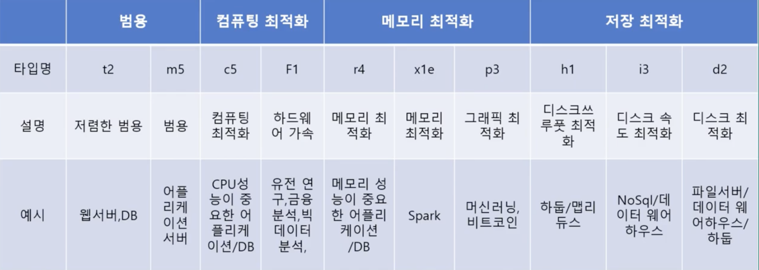 aws ec2에서는 원하는 컴퓨팅, 메모리, 네트워킹 또는 스토리지 요건에 맞는 여러 인스턴스 유형을 선택할 수 있습니다.