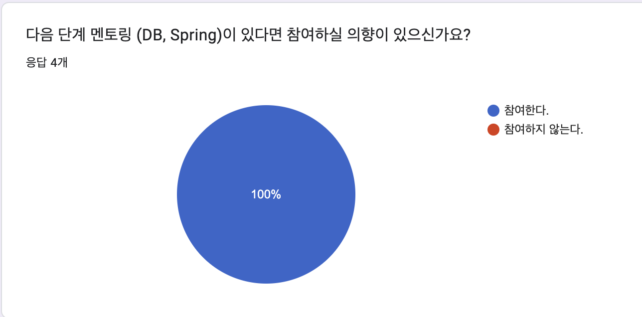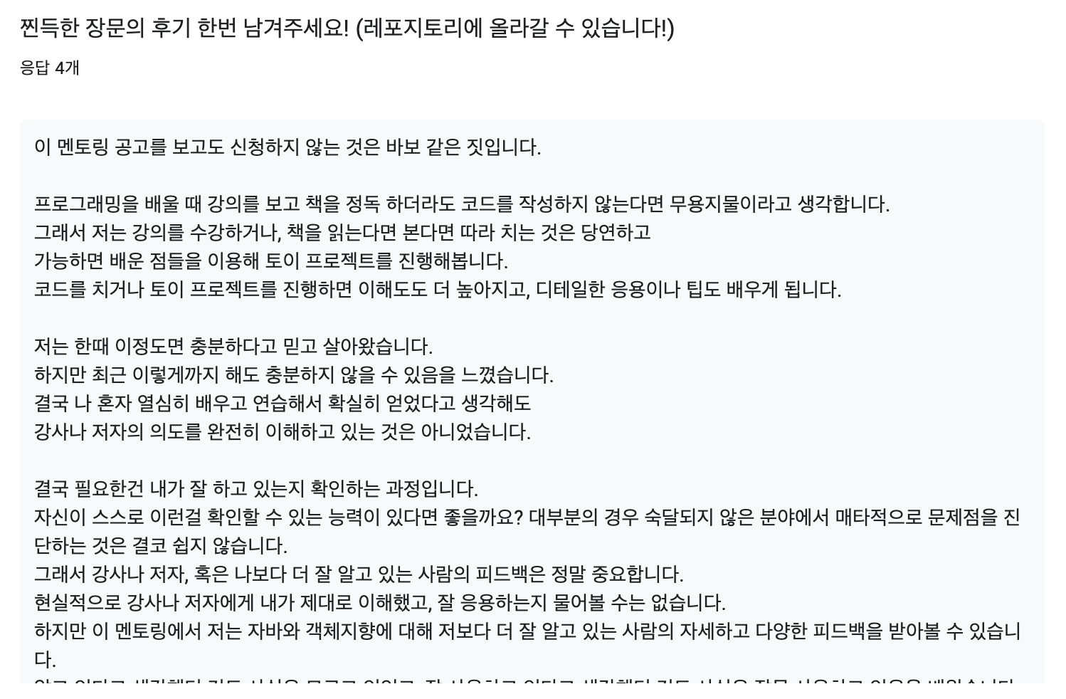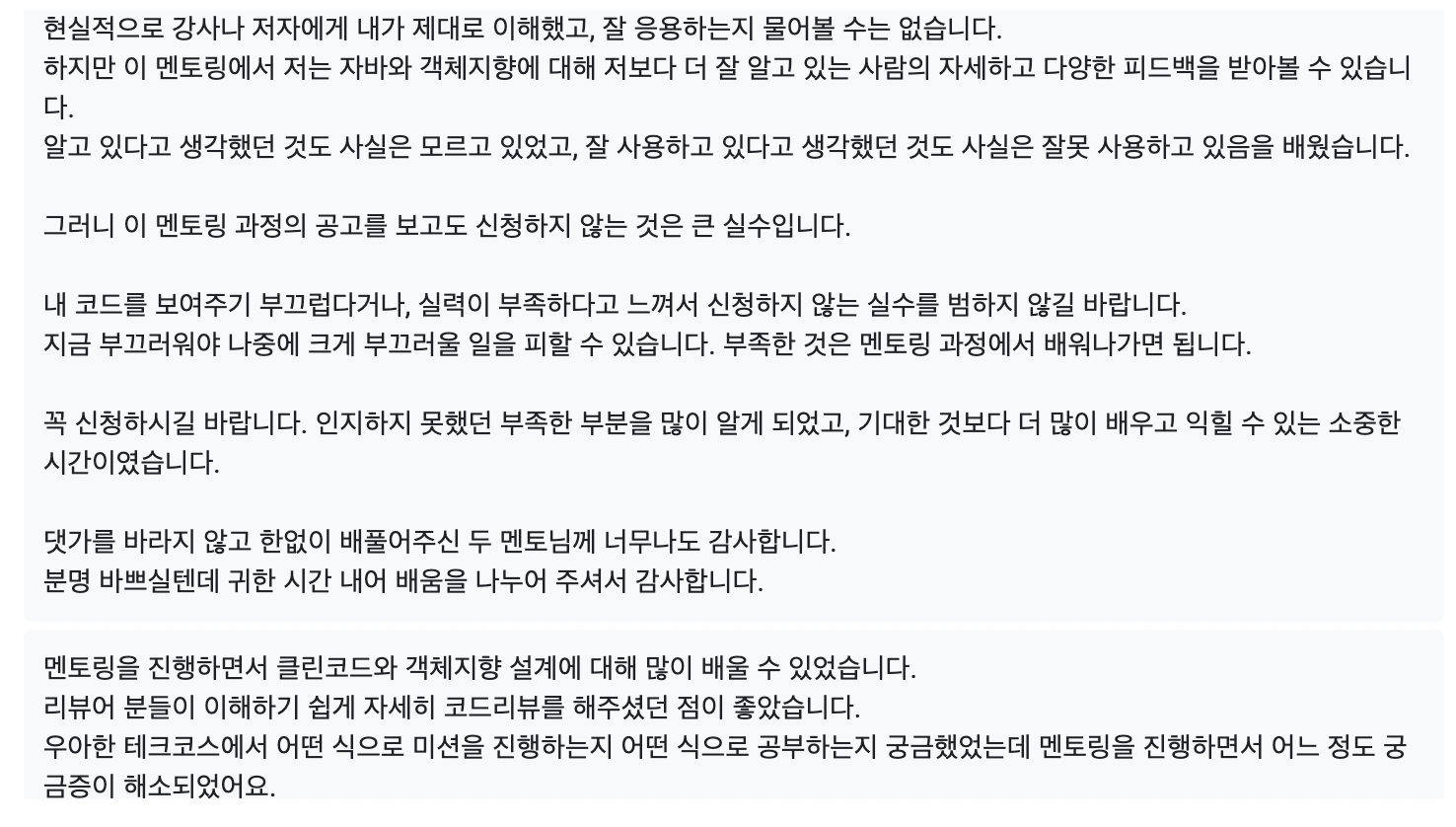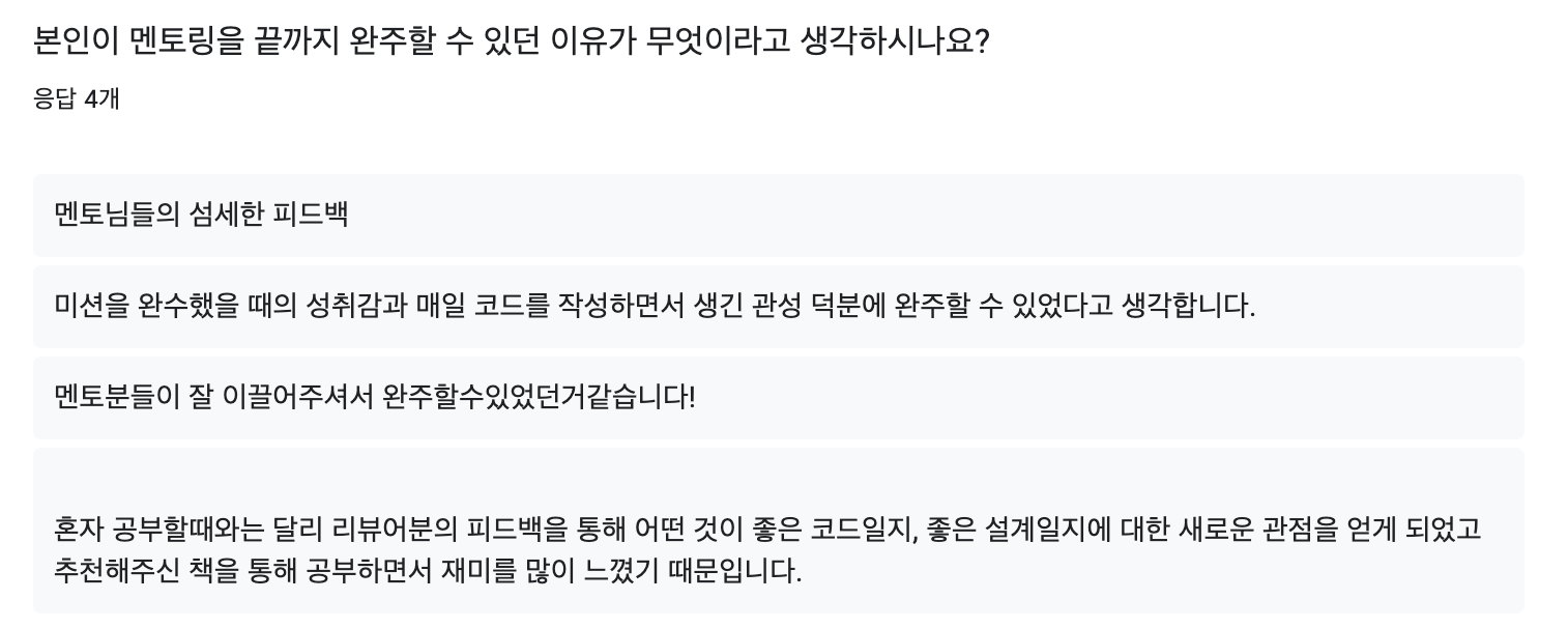 실제로 마지막 미션 때는 사전과제의 코드보다 훨씬 더 나아진 퀄리티의 코드를 제출하는 멘티분들을 볼 수 있었고 너무 뿌듯했다.
