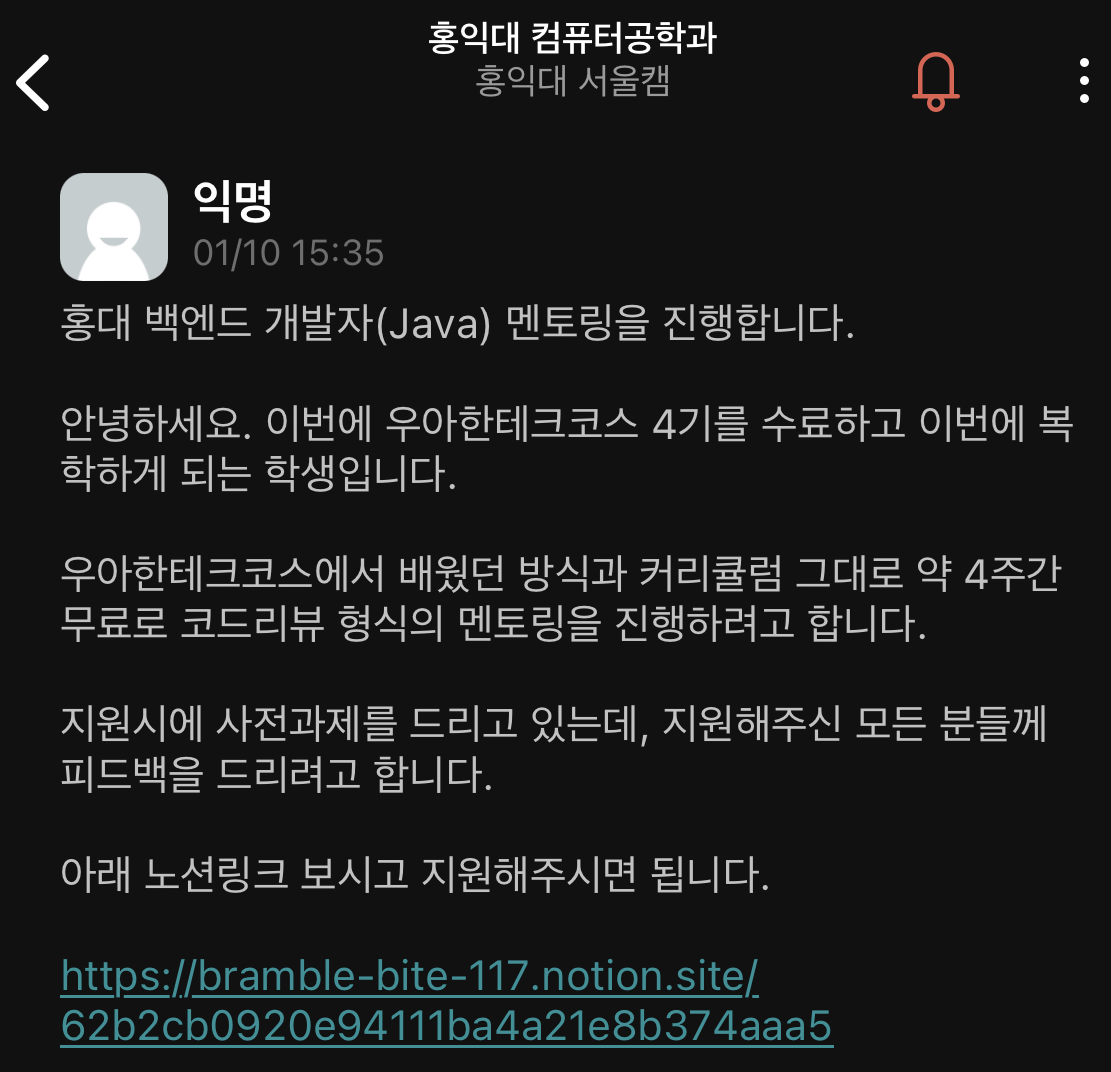 학기중에는 학생분들이 미션을 소화할 시간이 없을 것 같았고, 사전과제를 받기 위해서는 실제 멘토링을 진행하는 기간보다 훨씬 전부터 진행해야 했다. 그렇게 깨달았을때가 1월달 초였고, 3월에 개강한다는 것을 생각해봤을때 완벽한 기획을 하고나서 모집을 하려면 늦을 것 같았다. 그래서 일단 에타에 글부터 올렸다. 급하게 멘토링용 팀 레포지토리를 파고, 우테코 프리코스 과제를 fork하고, 최소한의 사전미션을 진행하기 위한 가이드라인정도만 수정해서 모집을 시작했다. 모집을 시작하는 동시에 제대로된 일정 기획을 시작했다.